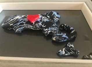 State of Massachusetts with frame. The clay sculpture is attached to glass of frame and is open with frame surround. Frame is gray color and is 5×7″. Background is Strathmore card stock painted with acrylic paint.
